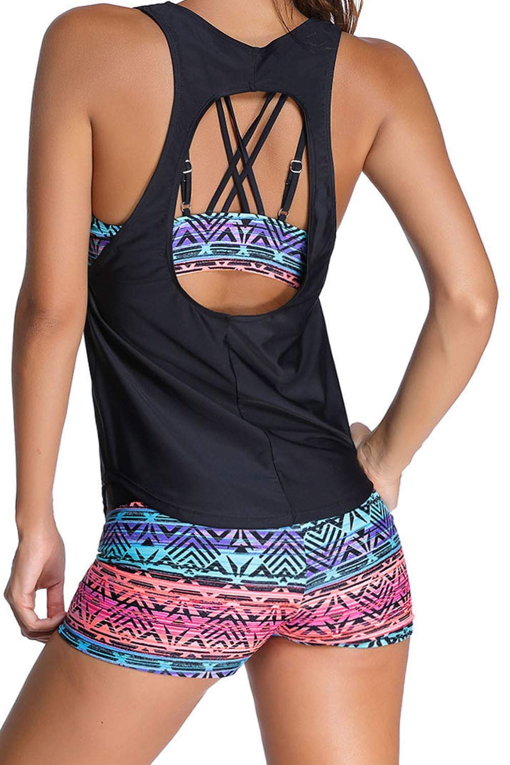 ATTRACTIVE DESIGNS: 3 Piece Versatile Designs, Racerback Style Top, Back Crisscross Straps Embellishment, Sexy Back Cutout SUPPORT FEATURES: Bikini top inside is designed with removable bra paddings and non-underwire to provide a modest support.